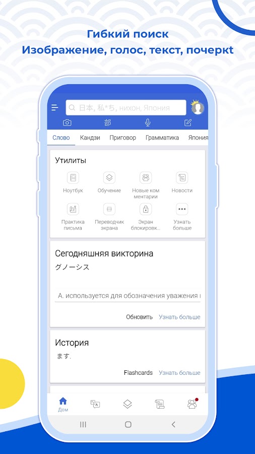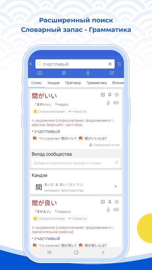 — Поиск лексики, кандзи, структур предложений, грамматики с объяснениями и примерами