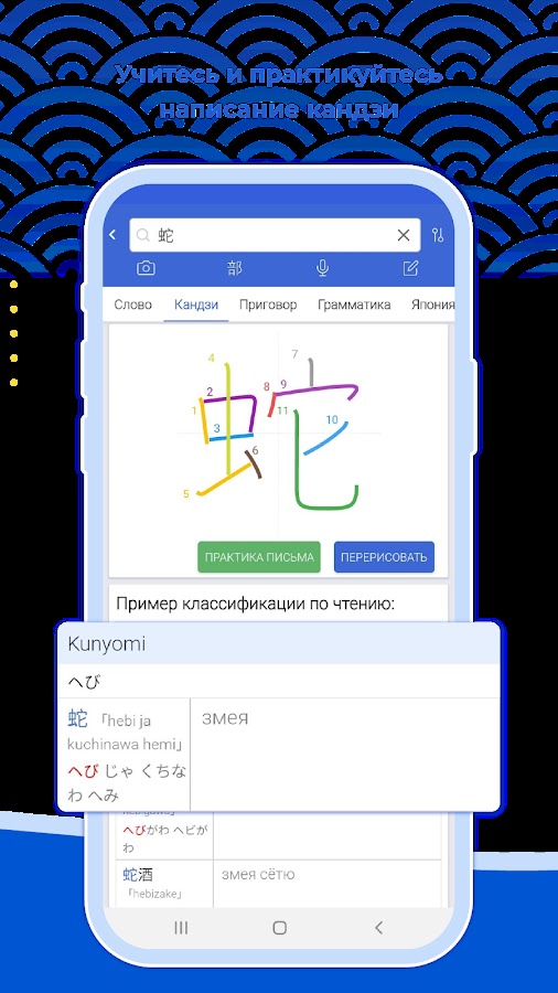 — 12 000+ кандзи (иероглифов): значение, чтение Он’ёми/Кун’ёми, примеры использования