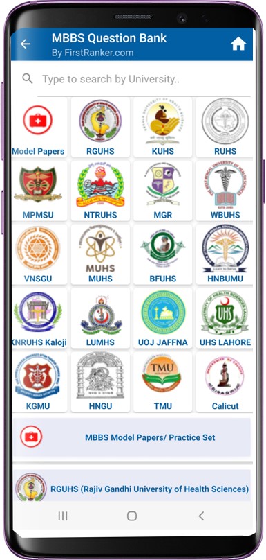 Приложение MBBS Question Bank охватывает ресурсы ведущих медицинских университетов, включая AIIMS, RGUHS, KUHS, MUHS, KGMU, UHS Lahore, NTRUHS, MGR, RUHS, MPMSU, KNRUHS, WBUHS, VNSGU, BFUHS, HNBUMU, HNGU, ABVMU, GU, BUHS, LUMHS, JAFFNA, Calicut, TMU, TMC и многих других.