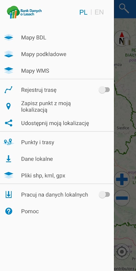 После загрузки соответствующих данных приложение работает и при отсутствии подключения к Интернету. Механизм загрузки данных для автономной работы позволяет использовать карты лесничеств и национальных парков. Вместе с картами, которые сохраняются в растровом виде, загружаются векторные данные с описательными атрибутами для лесов PGL LP.