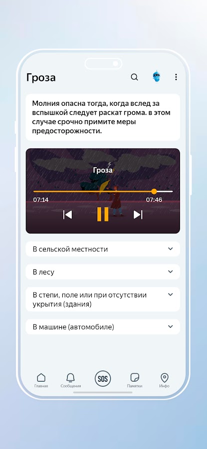 Приложение позволяет подготовиться к различным чрезвычайным ситуациям, получать актуальную информацию о возможных угрозах и рисках.