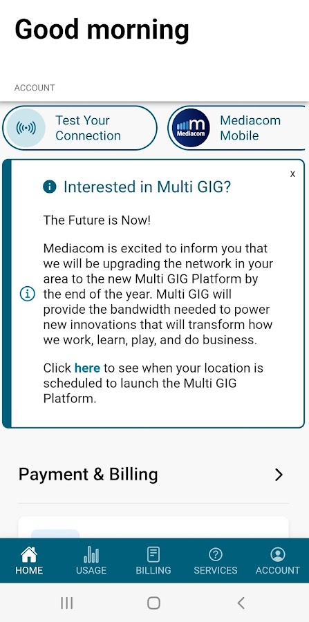 Приложение MediacomConnect MobileCare — это новое поколение обслуживания клиентов, предоставляющее вам свободу доступа к вашей учетной записи в любое время и в любом месте без необходимости совершать телефонный звонок. Всего одним щелчком мыши вы можете просмотреть свой счет, проверить наличие отключений, устранить неполадки и многое другое! Ознакомьтесь со всеми функциями MediacomConnect MobileCare ниже: