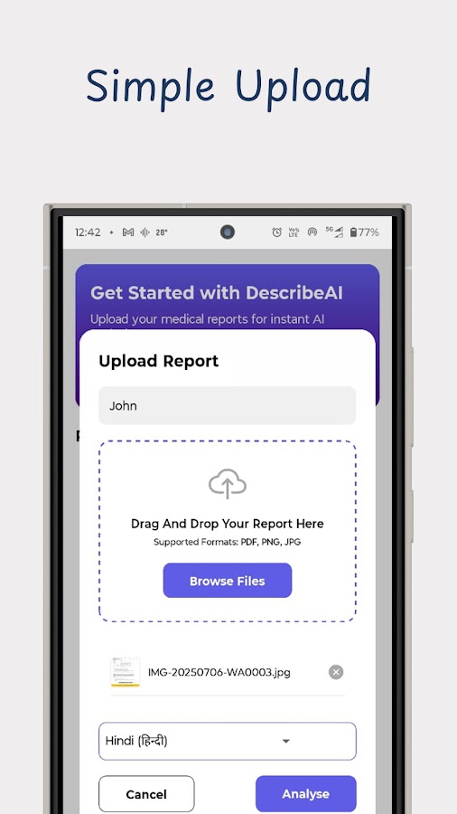 Проверка медицинских заключений: DescribeAI позволяет загружать и проверять свои медицинские заключения онлайн. Просто сфотографируйте и загрузите свой отчет, и наши передовые алгоритмы проанализируют его, чтобы предоставить вам исчерпывающую информацию.