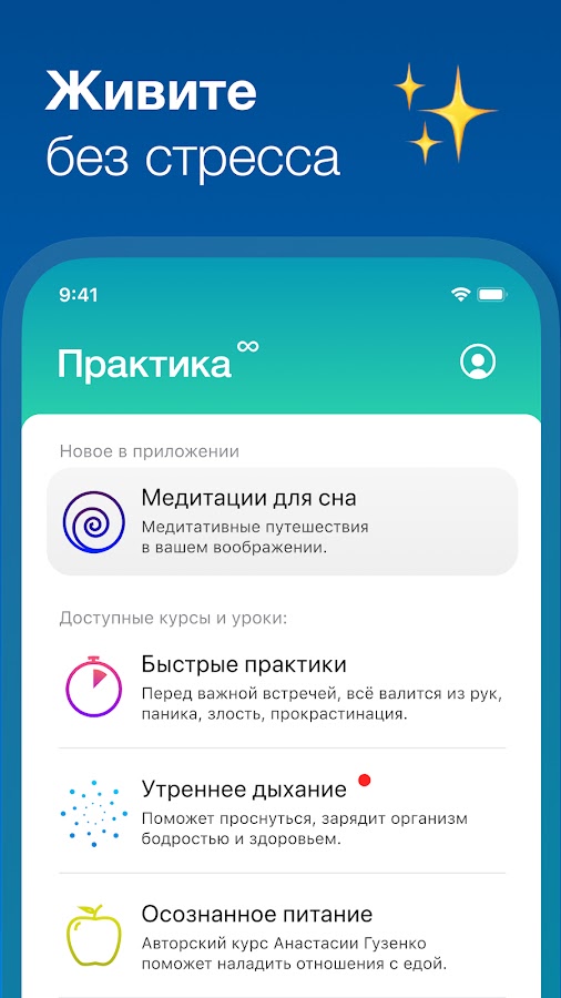 Практика — медитации на каждый день. На русском языке и без эзотерики. Расслабление, антистресс, крепкий и здоровый сон, дыхание по квадрату, осознанное питание, цифровой детокс — и много других курсов и практик в приложении. Уроки медитации от настоящих гуру своего дела!