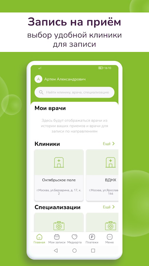 Быстрая персонализированная запись к врачу. Легкий выбор ближайшей поликлиники. Срочная или нестандартная запись на прием.