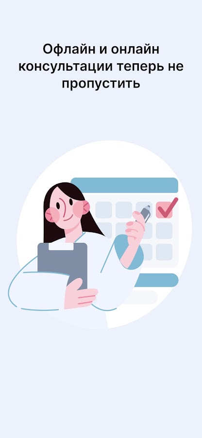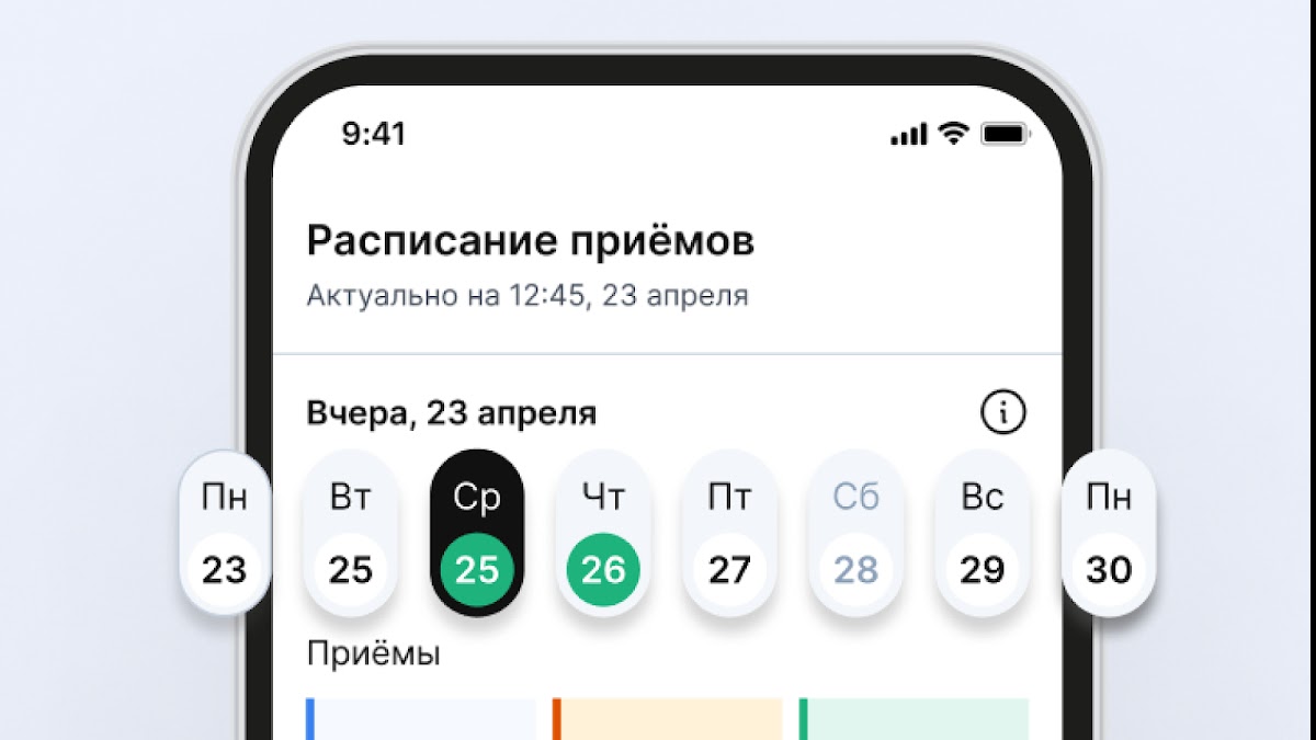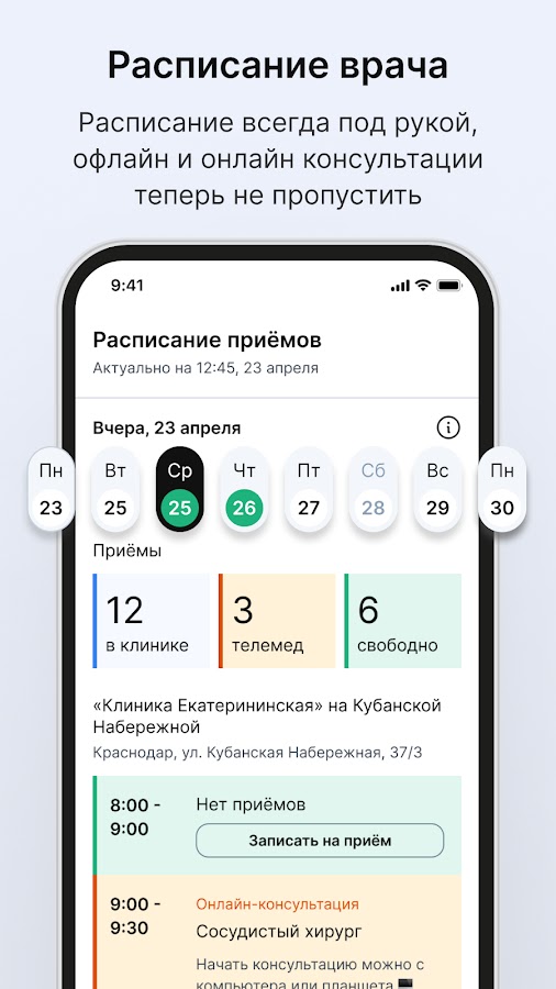 В приложении отображаются все ваши предстоящие приёмы из МИС. Если работаете в нескольких клиниках, сможете увидеть своё расписание в каждой из них.