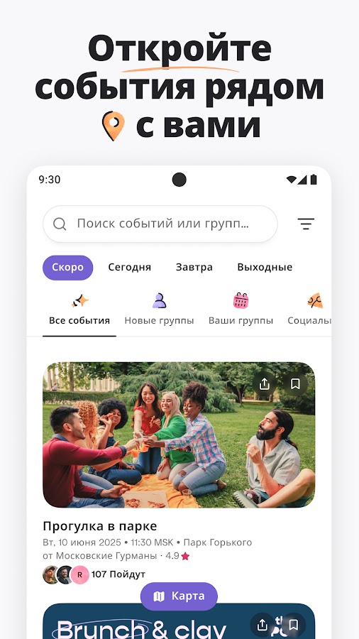 Находите местные меропрития и группы.