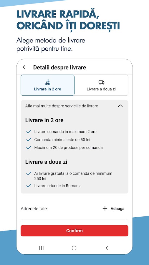 Быстро оформляйте заказы через приложение и выбирайте удобный для вас способ доставки: экспресс-доставка, доставка в тот же день или на следующий день.