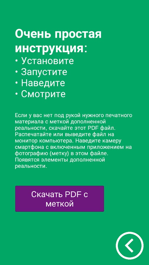 Если у вас нет под рукой нужного печатного материала с меткой дополненной реальности, скачайте этот PDF файл. Распечатайте или выведите файл на монитор компьютера. Наведите камеру смартфона с включенным приложением на фотографию (метку) в этом файле. Появятся элементы дополненной реальности.