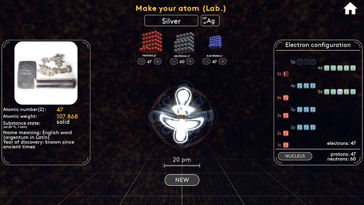В интерактивной лаборатории вы можете собрать любой атом и изучить структуру его электронных орбиталей. Соберите молекулу и посмотрите, какую она примет форму. Узнайте разницу между структурными и скелетными формулами. Исследуйте расположение атомов в молекуле и связи между ними.