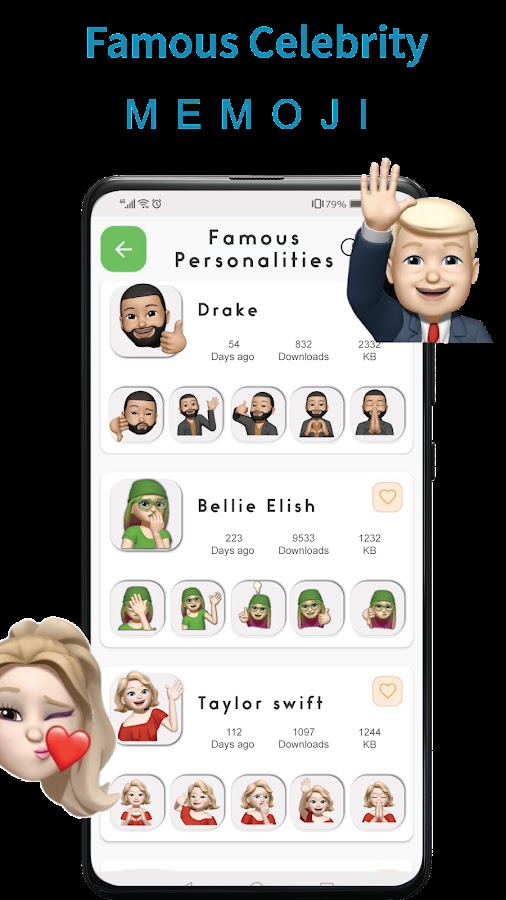 В нашем приложении Memoji есть стикеры со знаменитостями в виде мемодзи, в том числе стикеры с изображением политиков, спортсменов, музыкантов и актеров, таких как Билли Айлиш, Барак Обама, Эмма Уотсон и многих других. С помощью нашего приложения Emoji вы можете добавлять эмоции (Emoji для iPhone) в свой текст с помощью Memoji для WhatsApp 2023.