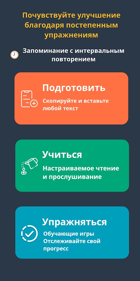 Приложение создает упражнения на запоминание вашего контента и заставляет вас отправиться в путь обучения, шаг за шагом усложняя упражнения.