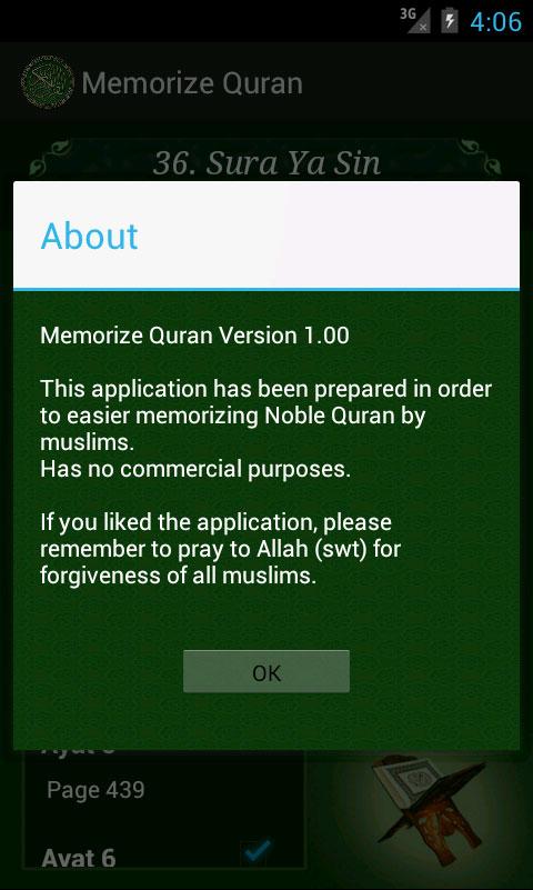 ИншаАллах это приложение поможет вам выучить Священый Коран. Выберите Суры из списка которые вы хотите выучить, Аяты будут добавлены в список чтения, затем выберите диапазон чтения. Выбраные аяты будут повторно читаться пока вы не запомните их.