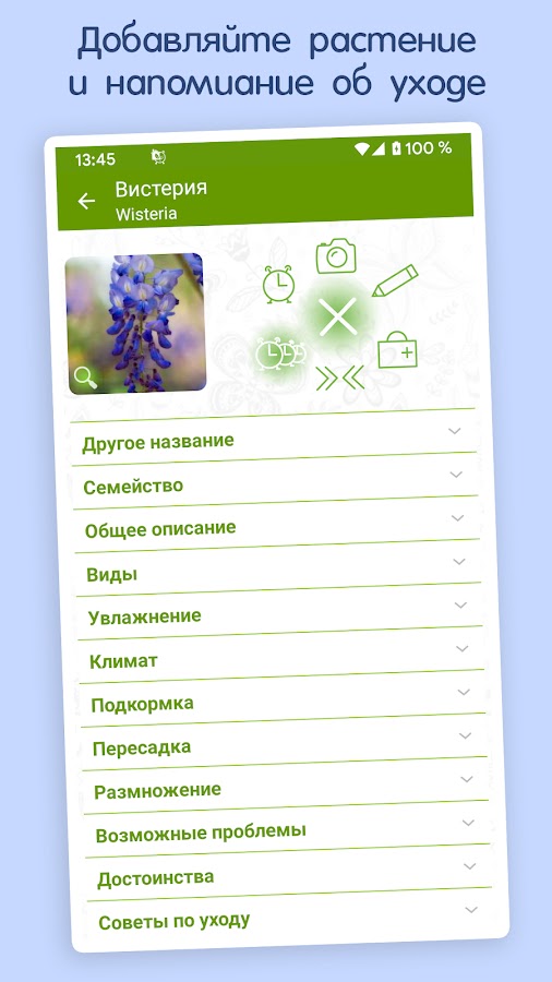 Менеджер комнатных растений поможет Вам организовать уход за растениями (полив, опрыскивание, подкормка, обрезка, пересадка, лечение болезней) и напомнит в заданное время. Имеется подробное описание по уходу и лечению. На текущий момент приложение содержит 501 растение.