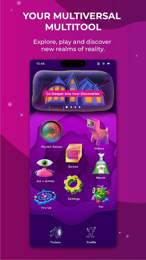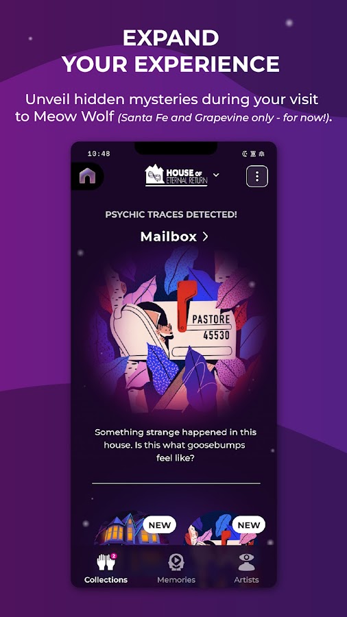 Здравствуйте, путешественники. Это ваш совершенно незаменимый инструмент для перемещения по мультивселенной Meow Wolf с помощью вашей ладони. Приложение Meow Wolf приглашает вас исследовать природу реальности и обещает стать ярким спутником в ваших межпространственных путешествиях.