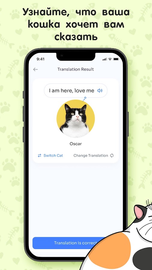 MeowTalk — первое в мире научно обоснованное приложение-переводчик кошек со звуками на базе искусственного интеллекта. Миссия переводчика — помочь каждому владельцу кошки лучше понять потребности своей кошки через ее голос и сделать так, чтобы ее питомцы прожили максимально долгую и счастливую жизнь: