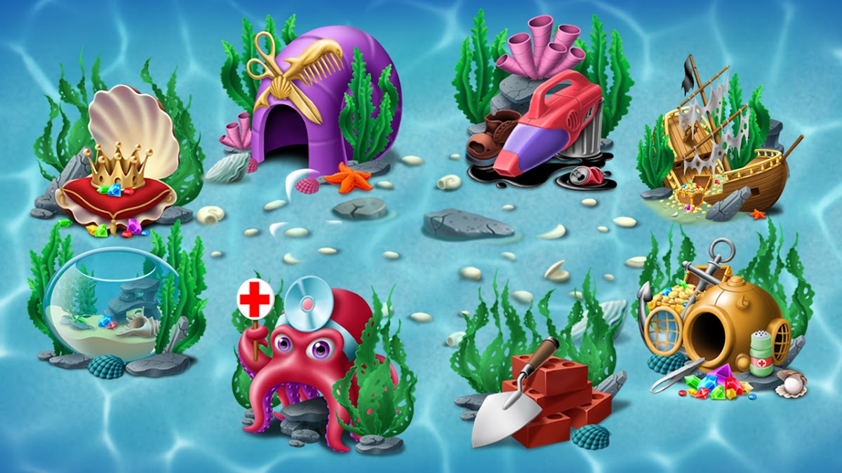 В процессе игры вашим малышам придется выполнить много увлекательных заданий: очистить дно океана от мусора и грязи, отремонтировать старый подводный дворец, создать новый дизайн и внести изменения и улучшения в аквариум, вылечить различные болезни рыб и других обитателей морских глубин и многое другое. И самое интересное – вы будете создавать новый стиль для девочки русалки, подбирать ей стильные прически и купальники, искать предметы и клады морских пучин. А веселый дельфин, которым вы будете управлять чтобы собрать больше монеток и преодолеть множество препятствий, не оставит вас равнодушными и подарит много ярких и положительных эмоций.