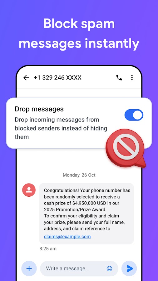 • Блокировка спама и нежелательных номеров — блокируйте номера или определенные сообщения вручную, чтобы контролировать ситуацию.