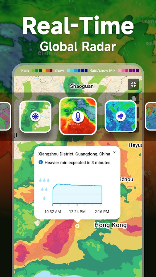 Вы можете увидеть состояние дождевых облаков, количество дождя и направление ветра.