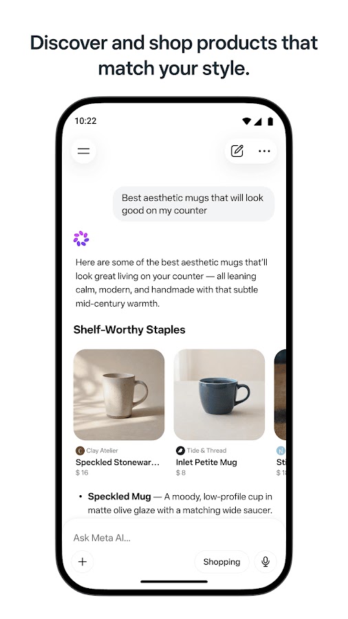 • Делайте покупки с умом: опишите, что вы ищете, или сделайте снимок, чтобы найти вдохновение. Meta AI учитывает авторов, на которых вы подписаны, и бренды, которые вы любите, чтобы предлагать рекомендации, отражающие ваш стиль.