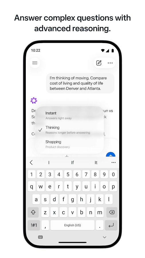 • Продумайте сложные вещи: будь то важное решение или быстрый вопрос, Meta AI поможет вам все обдумать. Включите функцию «Мышление», чтобы шаг за шагом анализировать сложные вопросы.