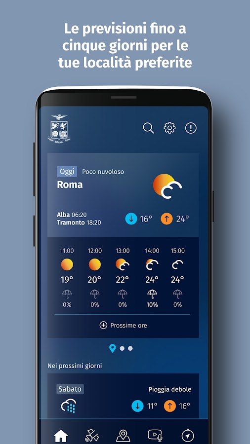 Официальное приложение Метеорологической службы ВВС (www.meteoam.it) предоставляет прогнозную метеорологическую информацию, касающуюся территории страны, и точечные прогнозы по всему миру.