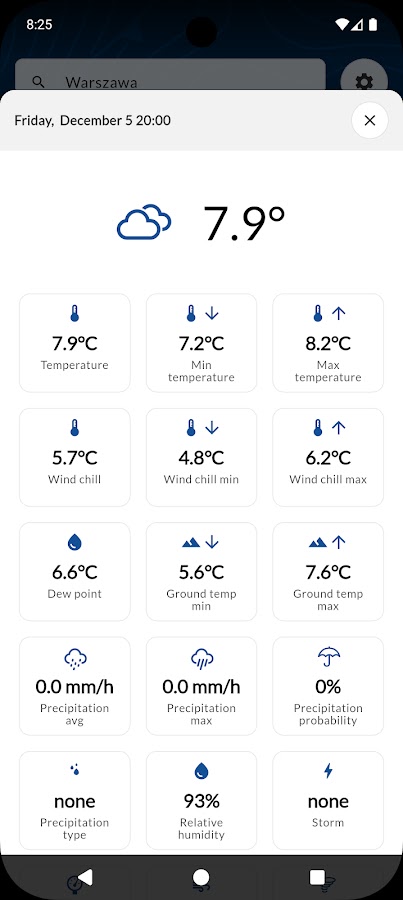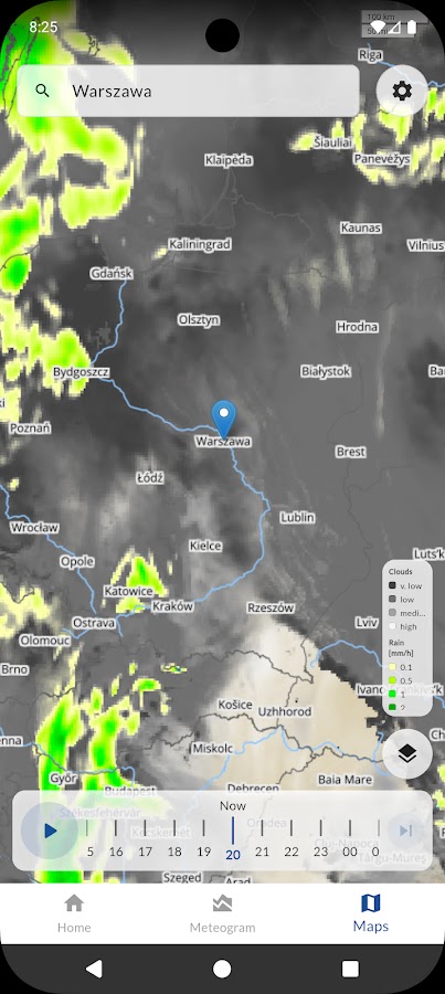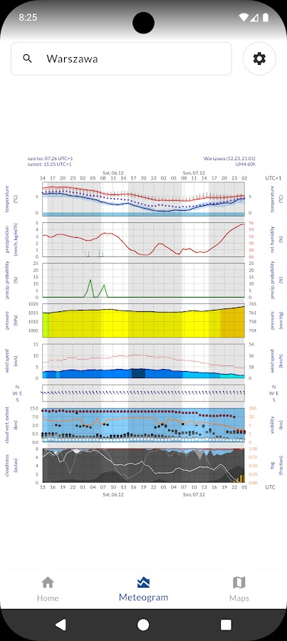 Приложение позволяет просматривать численные прогнозы погоды в виде наглядных метеограмм — специально разработанных графиков, отображающих ключевые метеорологические параметры. Более подробные данные, включая числовые значения и значки погоды, доступны на главной вкладке приложения. Кроме того, раздел «Карты» предоставляет более широкий контекст атмосферных явлений, включая радиолокационные слои и визуализацию осадков, ветра и облачности.
