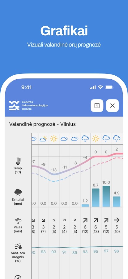 С помощью нашего приложения вы легко получите актуальную информацию о погоде в выбранном вами регионе Литвы. Вы можете просматривать её в удобном для вас формате: в таблице, графике или на карте.