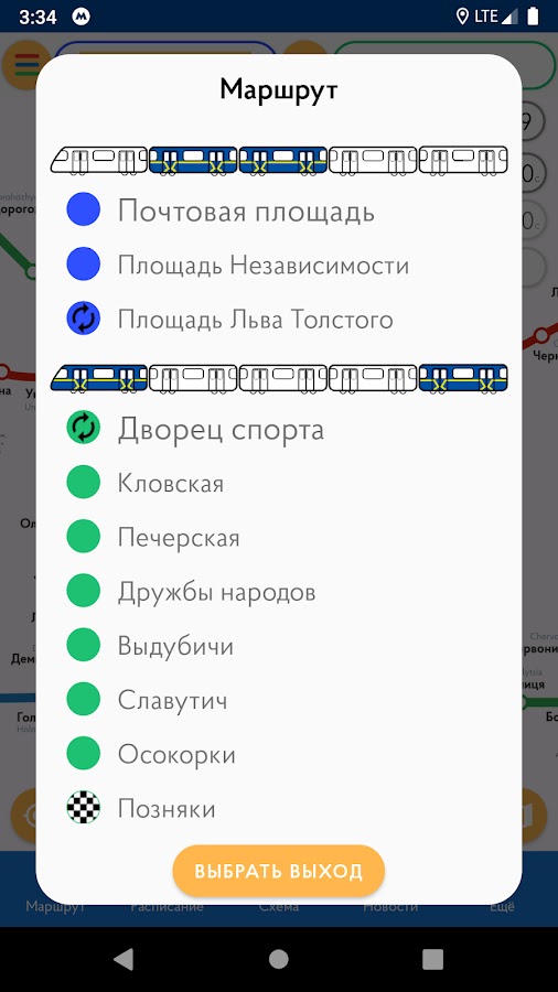 5) Вы можете выбрать нужный Вам выход и приложение укажет ближайший вагон к выходу на заданной станции метро.