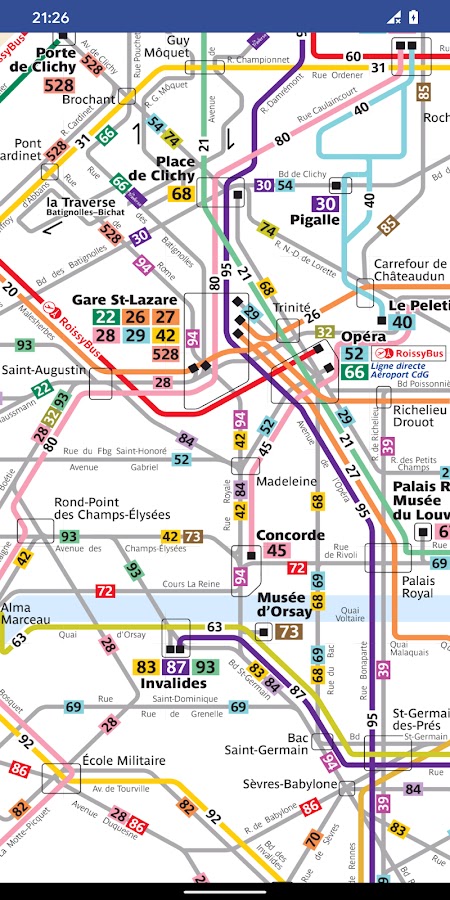 Схемы линий Парижа. Включает полный набор карт метро, автобусов, ночных автобусов, маршрутов в аэропорт, RER и Transiliens.