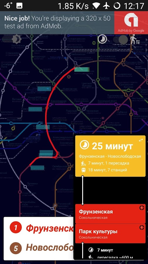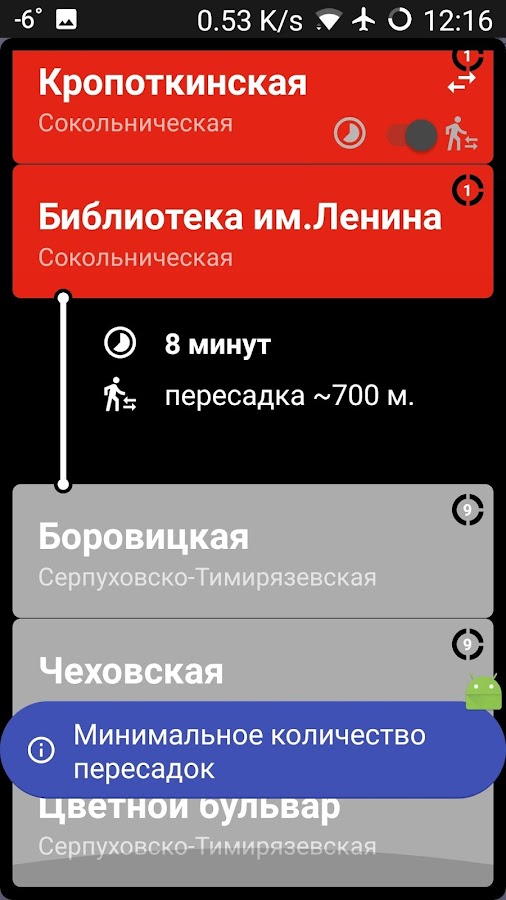 Интерактивная схема метро города Москвы с поиском пути в режиме оффлайн. Вы можете использовать голосовой поиск для ввода названий станций, если у вас заняты руки. Приложение найдет маршрут и рассчитает время пути. Также есть переключение на ночную тему. Два режима поиска пути: за минимальное время и за минимум пересадок. Режим «Минимальное количество пересадок» учитывает время перехода — чем оно больше, тем меньше приоритет этого пути.