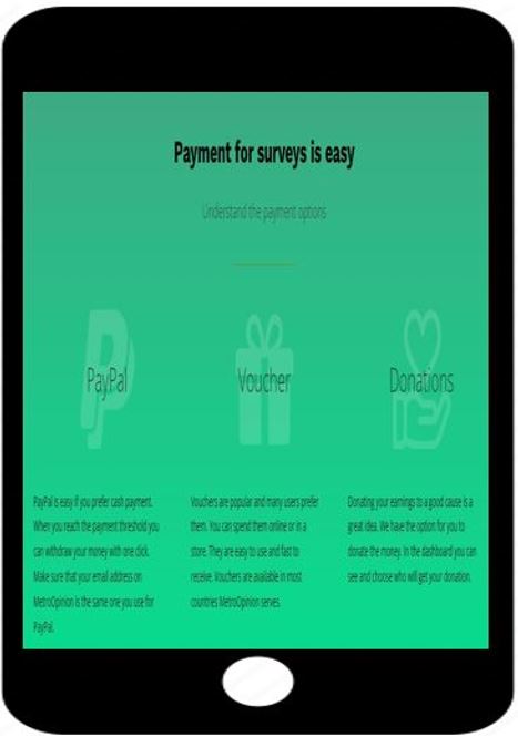 Оплата легко с MetroOpinion. Вы можете выбрать между несколькими вариантами оплаты. У нас есть тысячи счастливых членов MetroOpinion, которые получили от нас деньги.