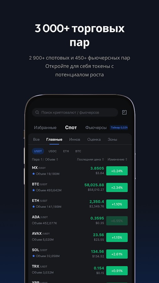 Ознакомьтесь с более чем 3 000 крипто-активов, включая Bitcoin (BTC), Ethereum (ETH), Solana (SOL), Ripple (XRP), Tether (USDT), MX Token (MX), Dogecoin (DOGE), Shiba Inu (SHIB), PEPE (PEPE), Notcoin (NOT), Toncoin (TON), USDC (USDC), Binance Coin (BNB), People DAO (PEOPLE), Chainlink (LINK), Cardano (ADA), Polkadot (DOT), Decentraland (MANA), Gala Games (GALA), Polygon (POL) и другие.
