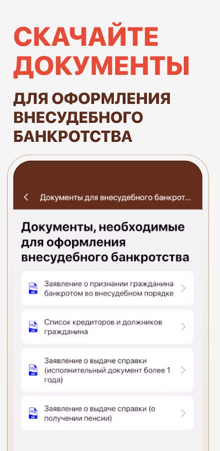 — Инструкция по подаче заявления на банкротство — приложение предоставляет подробные пошаговые инструкции и шаблоны, чтобы упростить процесс подачи документов. Приложение напомнит о всех обязательных справках и документах, которые нужны для успешной подачи заявления.