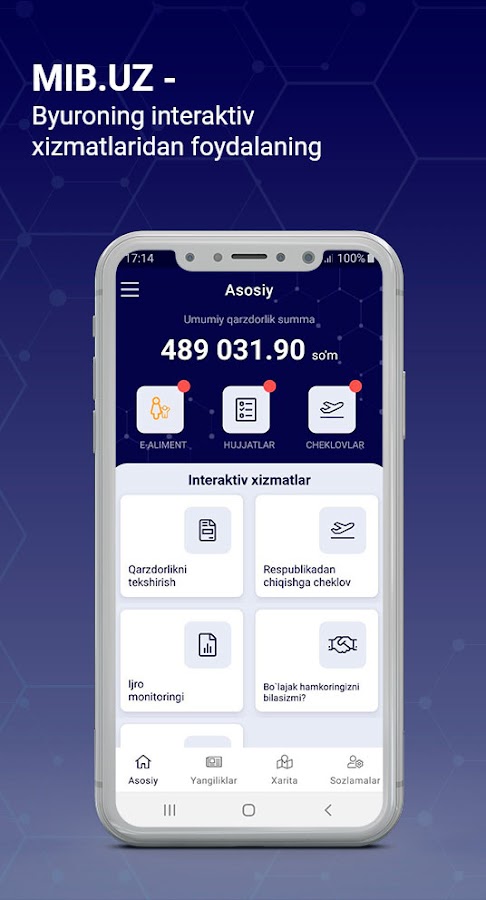 Tizimda bo`layotgan yangiliklardan, hududiy bo`lim manzillarini bilishingiz mumkin. Interaktiv xizmatlar orqali qarzdorlikni tekshirish, chegaradan chiqishga taqiq borligini tekshirish imkoniyatiga ega bo`lasiz!