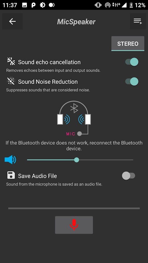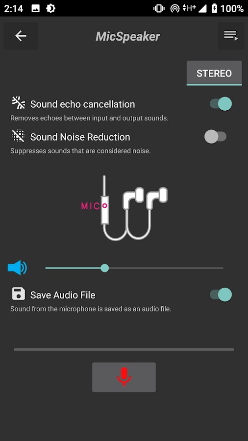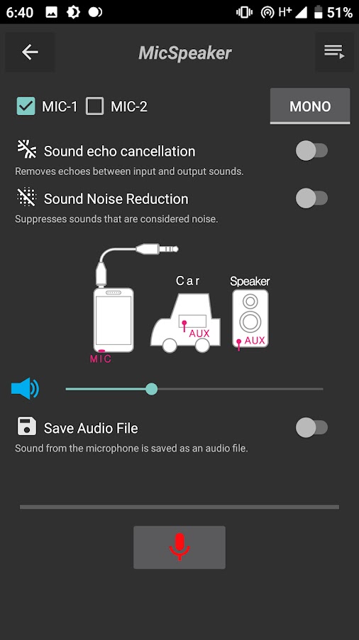 Приложение микрофона-динамика может подключать кабель AUX к другому аудиоустройству для вывода выхода микрофона смартфона на аудиоустройство.
