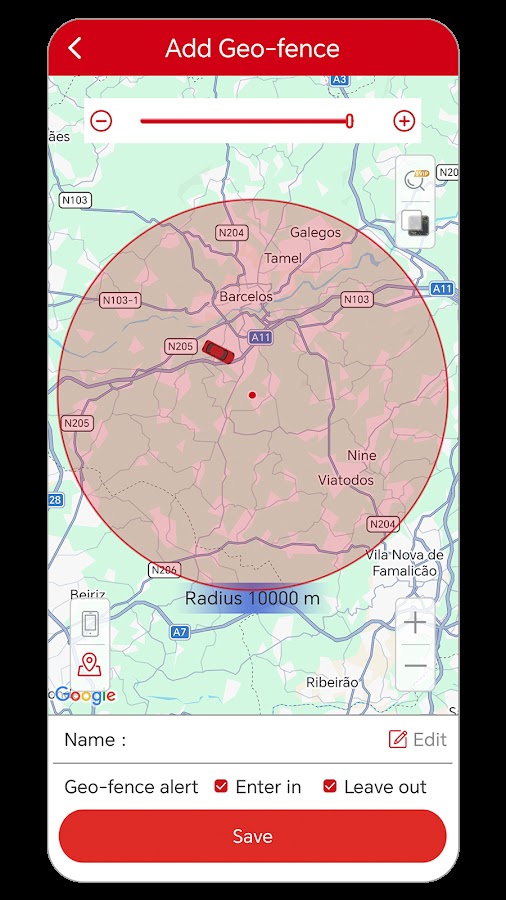* Геозона для установки зоны безопасности, приложение будет получать уведомления, когда устройство входит или выходит из этой зоны