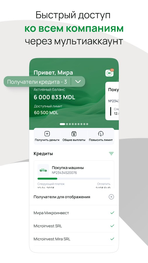 Microinvest – крупнейшая небанковская кредитная организация в Молдове, специализирующаяся на финансировании ММП, сельскохозяйственных производителей и других клиентов. Основанная в 2003 году, компания позиционирует себя как лидер на небанковском финансовом рынке. Более 20 лет мы способствуем развитию бизнеса и улучшению качества жизни потребителей, предоставляя финансовые решения через нашу сеть из 16 офисов по всей стране, с помощью квалифицированного персонала и цифровых каналов.
