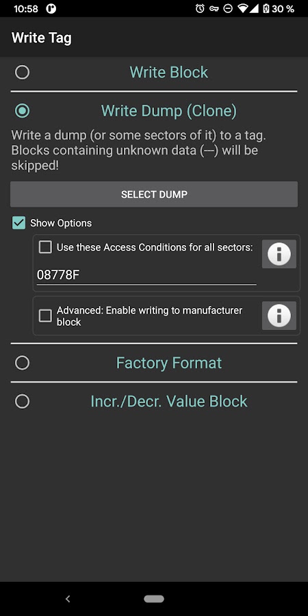 • Напишите блок производителя специальных тегов MIFARE Classic.