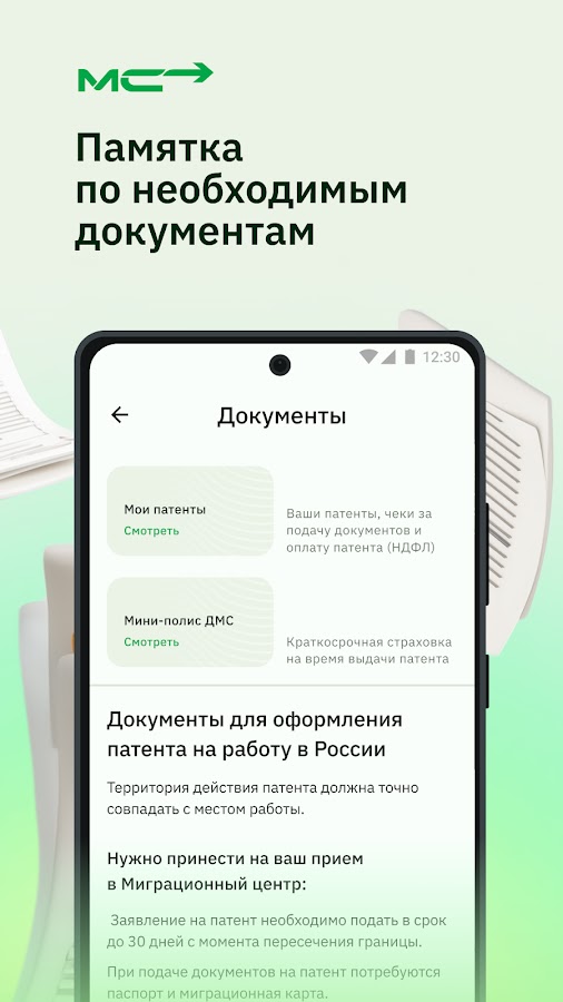 Приложение не выступает представителем правительства или государственного органа, предоставляет информацию о наличии свободных дат, времени с официального онлайн-сервиса https://mc.mos.ru/. Онлайн-запись на патент оказывает государственный орган. Сведения о порядке получения ИНН, запрете на въезд в Российскую Федерацию, наложенных штрафах и наличии исполнительных производств предоставляются из общедоступных официальных онлайн-ресурсов: