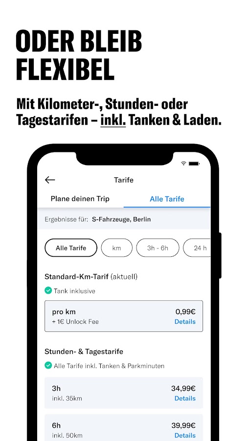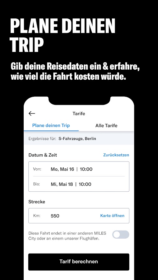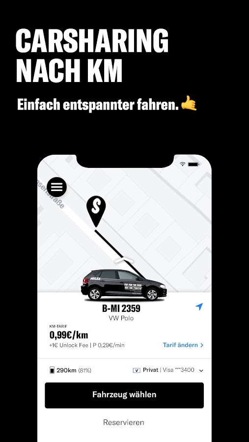 Никакого цейтнота – просто езжайте! С MILES вы платите за километр, а не за минуту. Вы можете наслаждаться путешествием по городу или природе в полной релаксации. От городского автомобиля до внедорожника или фургона: ваш идеальный автомобиль находится на расстоянии одного клика.