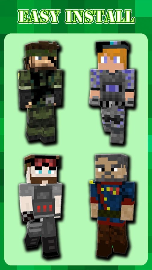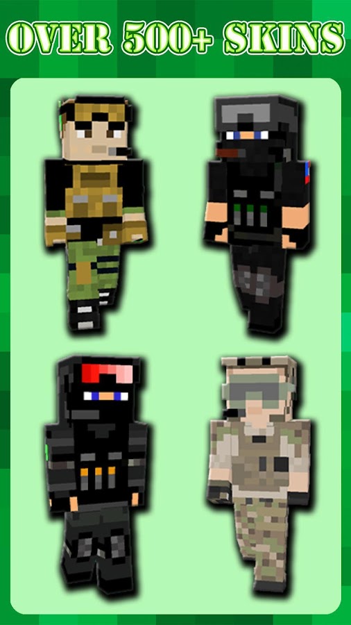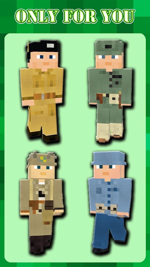 Перед вами уникальное приложение, где вы можете скачать скины для Майнкрафта™ абсолютно бесплатно. Надоело бесконечно искать скины по никам в интернете? Здесь вы найдете более 500 скинов в военной форме, которые подойдут всем фанатам игры Minecraft™ как для мальчиков, так и для девочек. Станьте одним из уникальных героев в игре, наше приложение 100% для этого подходит. Скачивайте на свое устройство скины, которые Вам понравятся.