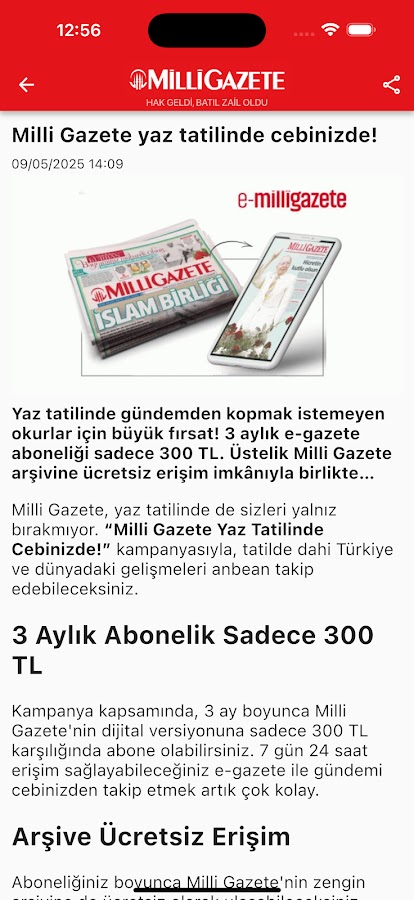 Milli Gazete теперь может читать все страницы Milli Gazete на ваших мобильных устройствах благодаря приложению e-milligazete, и вы можете обратиться к старой датированной Milli Gazete, выбрав дату в разделе архива.