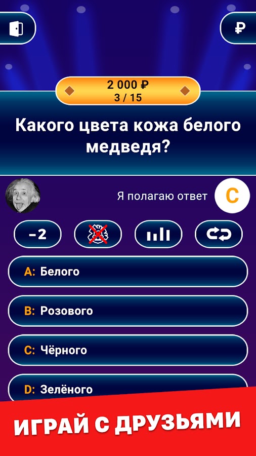 • 4 типа подсказок: убрать 2 неверных ответа, помощь аудитории, замена вопроса и помощь Эйнштейна