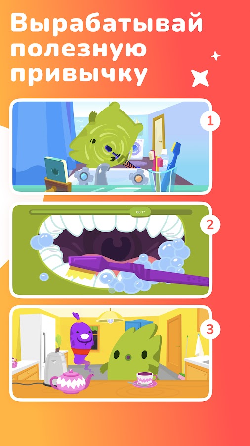 Присоединяйтесь к приключениям Мимизавра и подпевайте веселой музыке «Зюмба-Каказюмба», созданной специально для чистки зубов. А также получайте в конце чистки супер-достижения, как будто после каждой чистки приходит зубная фея с подарком.