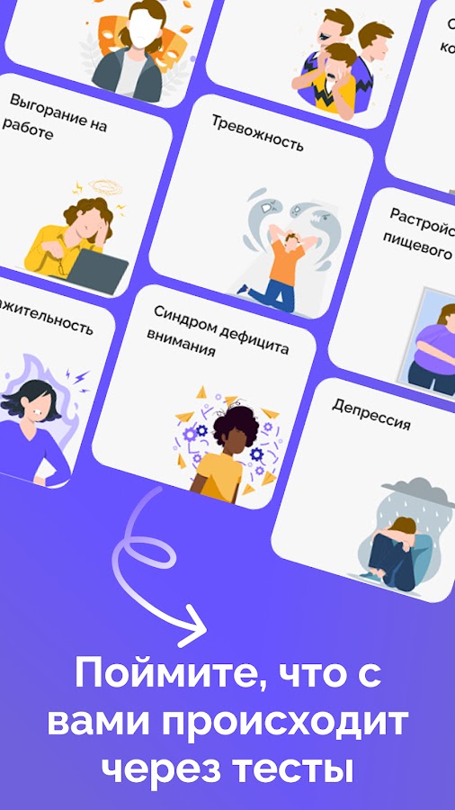 На данный момент доступна диагностика следующих психологических проблем: депрессия, расстройство пищевого поведения (РПП), невроз, СДВГ. После прохождения тестов вы сможете составить свой личный психологический портрет и проследить его в динамике.