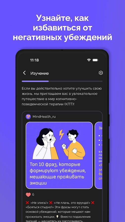 Мы разработали ряд интерактивных курсов по темам — депрессия, психическое здоровье. Благодаря нашим учебным материалам вы поймете основные принципы КПТ, научитесь правильно работать с дневником мыслей.