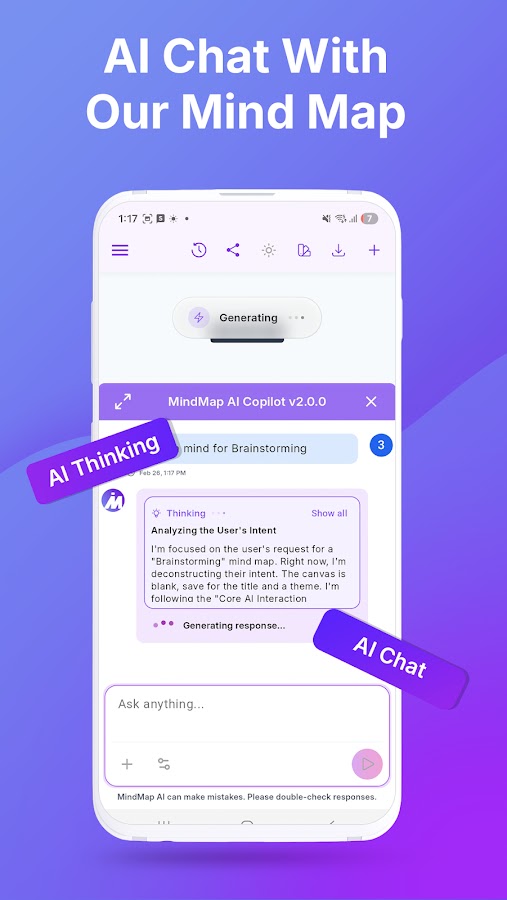 Мгновенно превращайте свои заметки, мысли и файлы в ментальные карты с помощью интеллектуального ИИ-копилот и нового режима «Мышление» для более чётких и логичных структур.