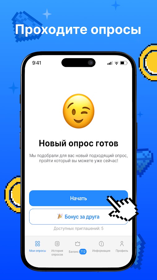 Миниопрос имеет простой и интуитивно понятный интерфейс, что позволит вам без проблем проходить опросы и получать баллы.