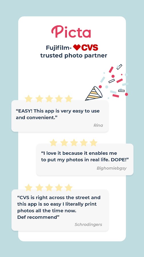 Скачайте приложение Picta x CVS Photo Print для Android бесплатно - последняя версия (10.41.0) уже доступна для установки на ваш телефон или планшет.